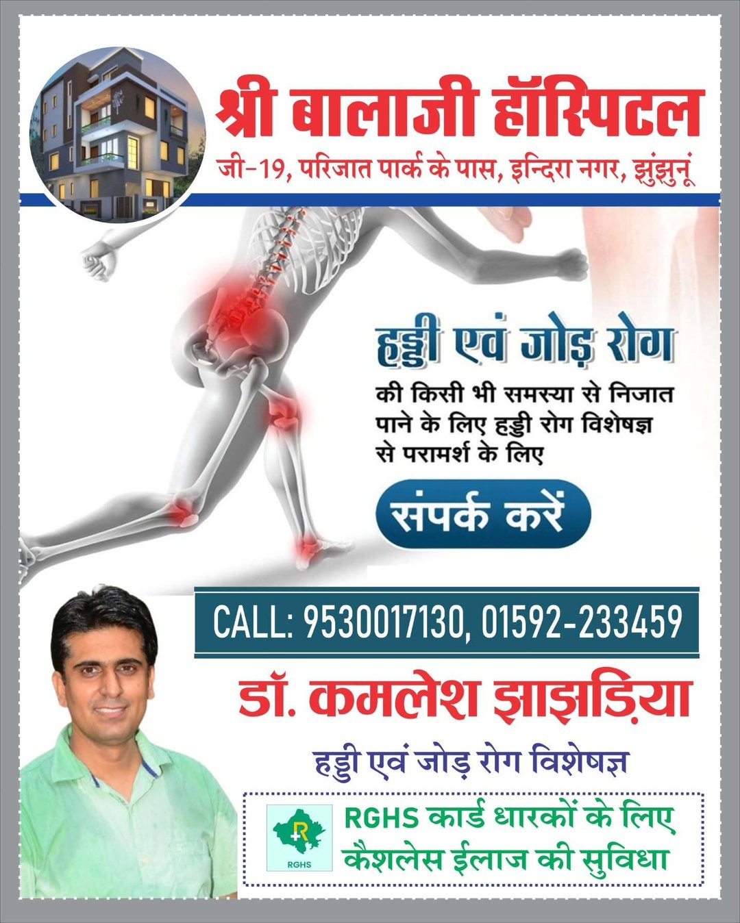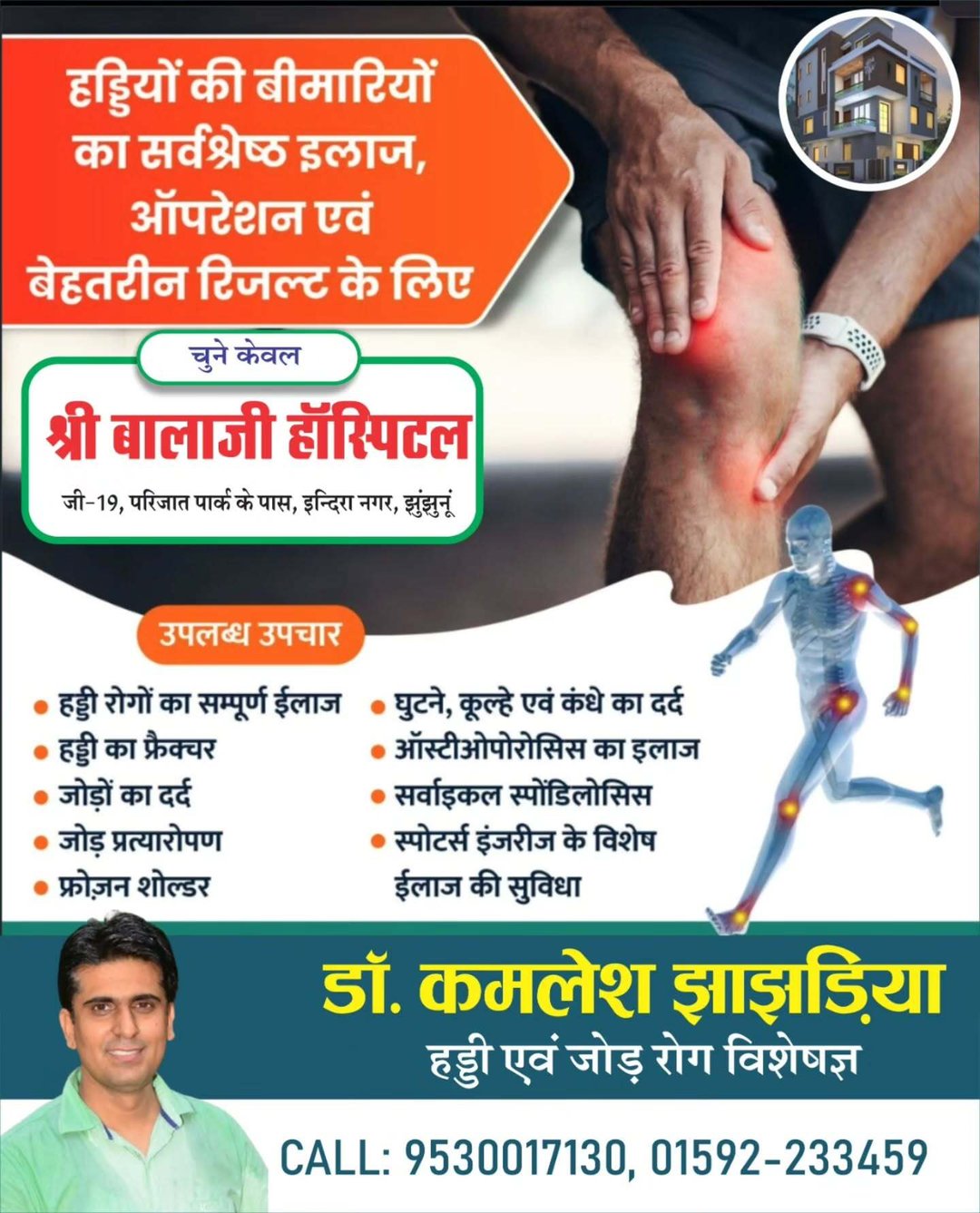 Shri Balaji Orthopaedics & General Hospital (Jhunjhunu) offers advanced orthopedic care by Dr. Kamlesh Jhajharia, specializing in: ✓ Knee/Hip Replacement ✓ Fracture Treatment ✓ Arthroscopy ✓ Sports Injuries ✓ Spinal Care ✓ Pain Management 🔹 24/7 Trauma Support 🔹 Modern Diagnostics 🔹 Patient-Centric Care #1 Orthopedic Hospital in Jhunjhunu for affordable, expert care!